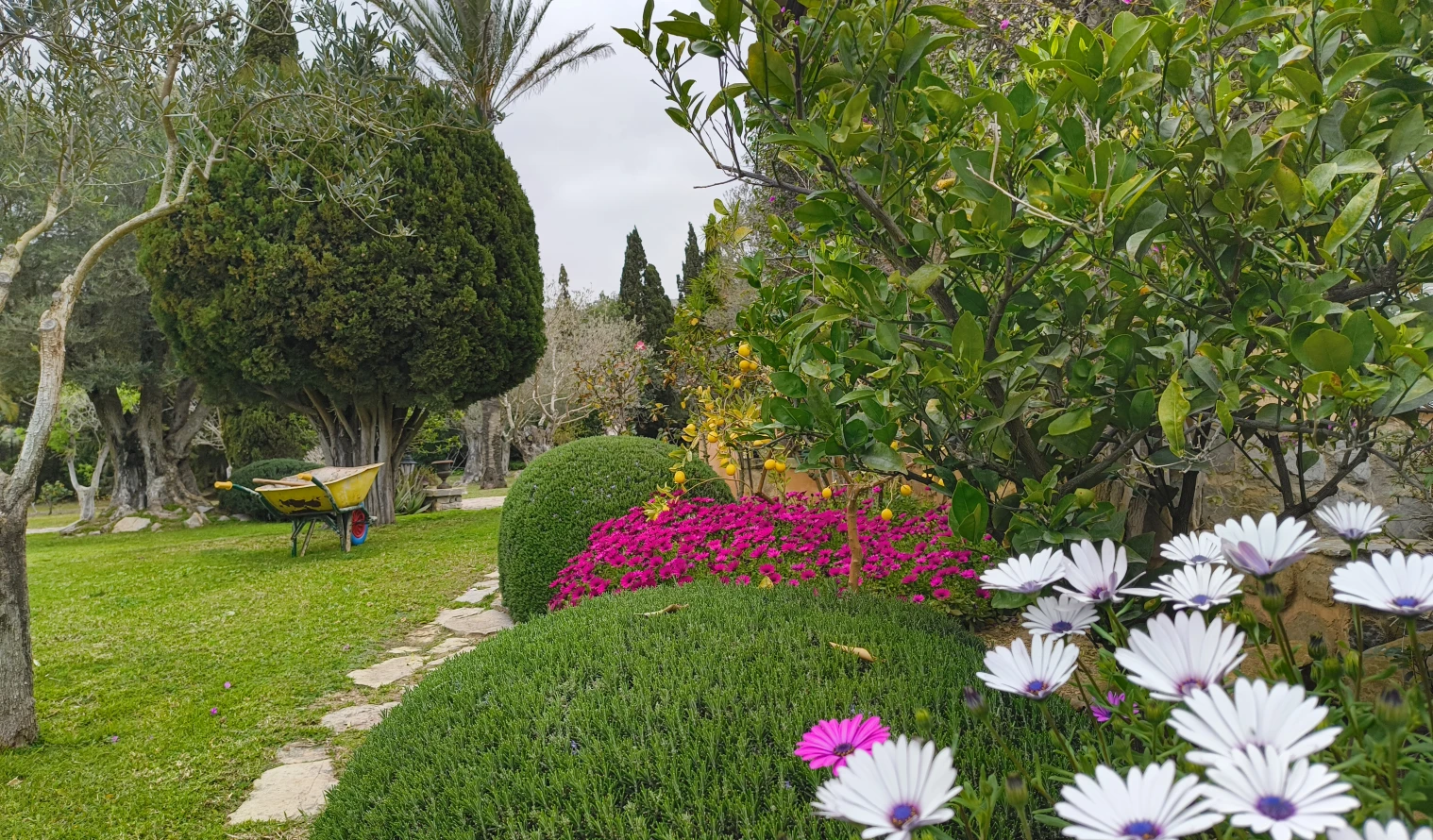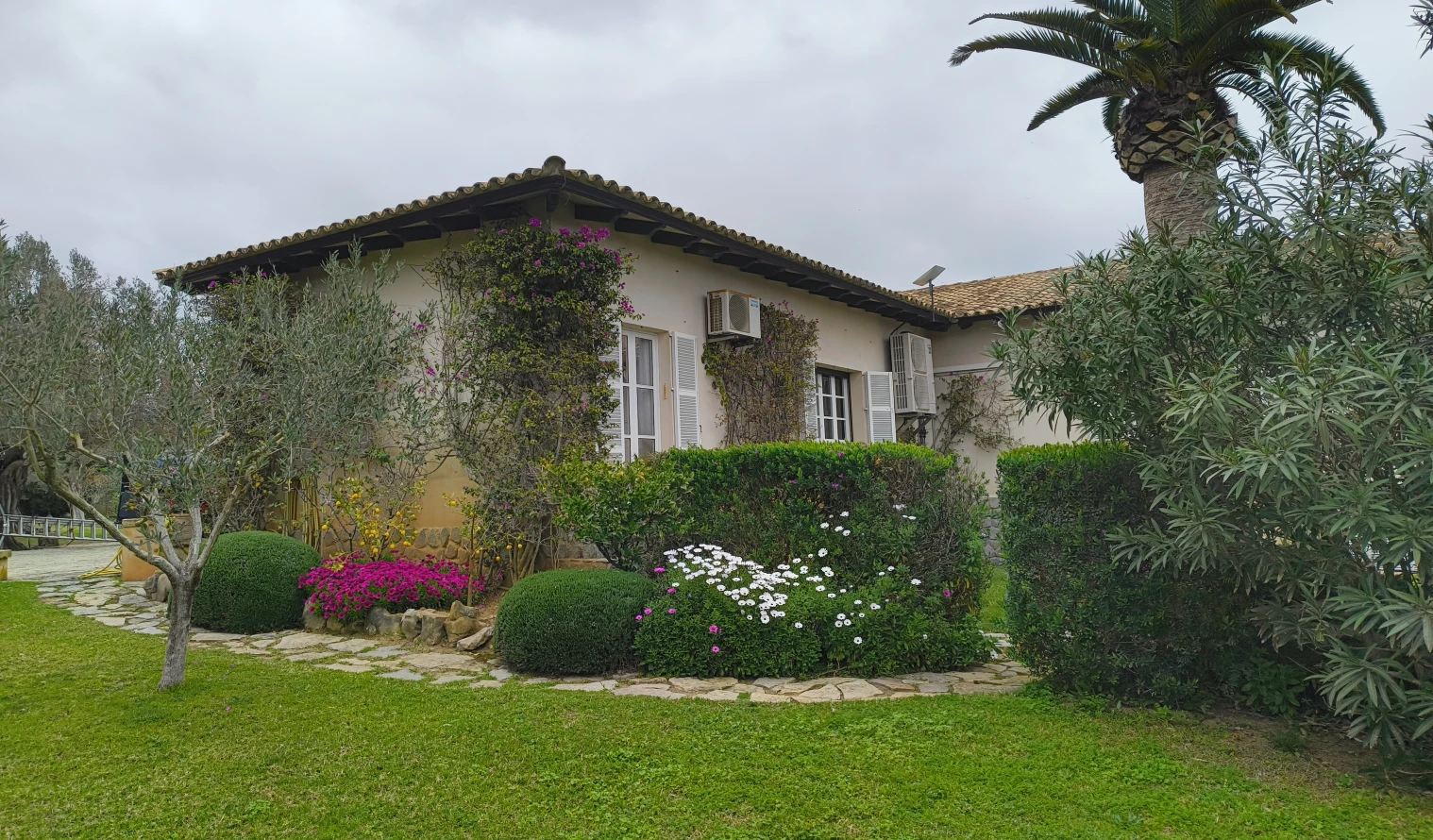 Esta finca consiste de un terreno con diversos niveles, seguido de la casa, que se encuentra en la zona más alta: al tener distintos niveles y un amplio terreno, cuenta con zonas de jardín, césped, frutales y una amplia zona de olivos.